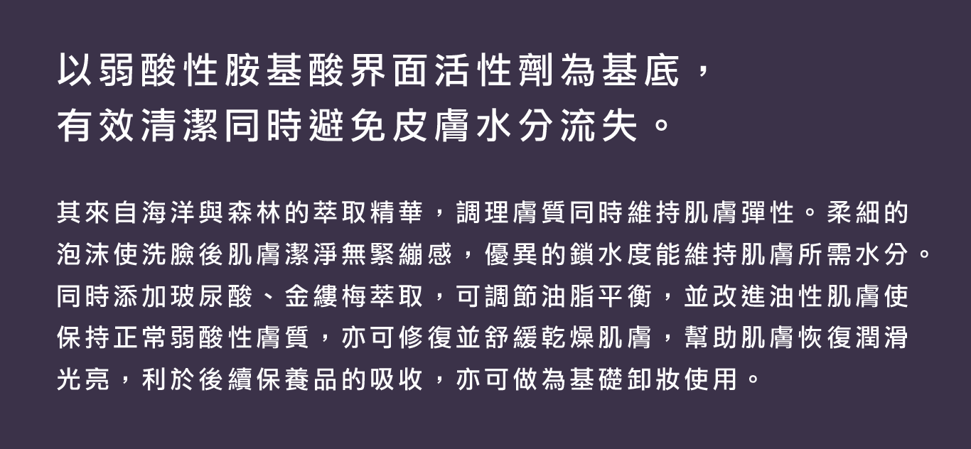 深層潔顏慕斯,能夠清潔空氣中殘留於肌膚的油脂髒污,也可輕鬆卸除日常妝容。添加高濃度玻尿酸,可維持肌膚保水度,不因清潔而乾澀。