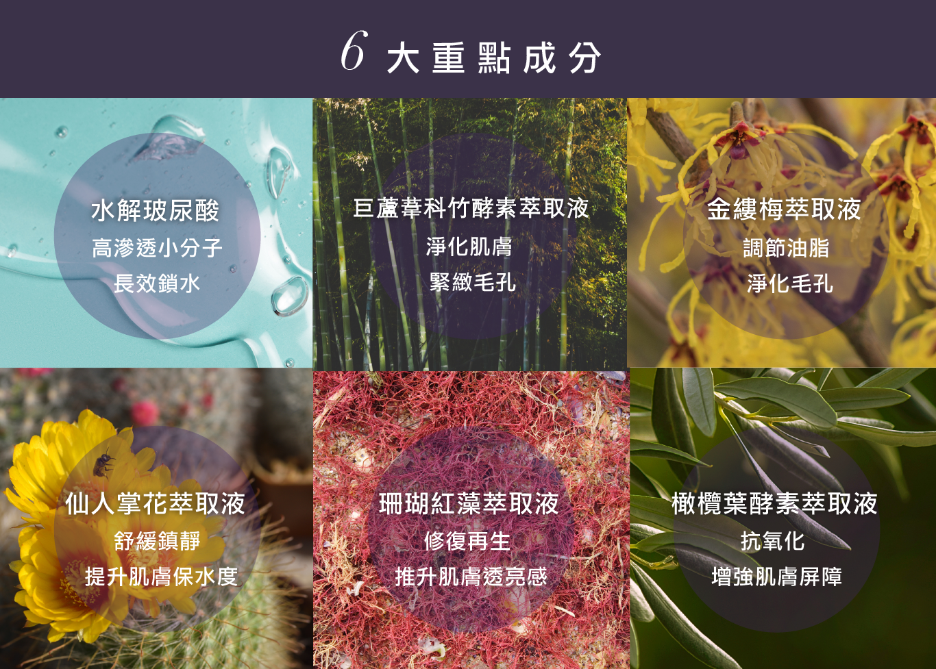 水解玻尿酸、仙人掌花萃取液、珊瑚紅藻萃取液、橄欖葉酵素萃取液、金縷梅萃取液、乳酸菌、巨蘆葦科竹酵素萃取液。